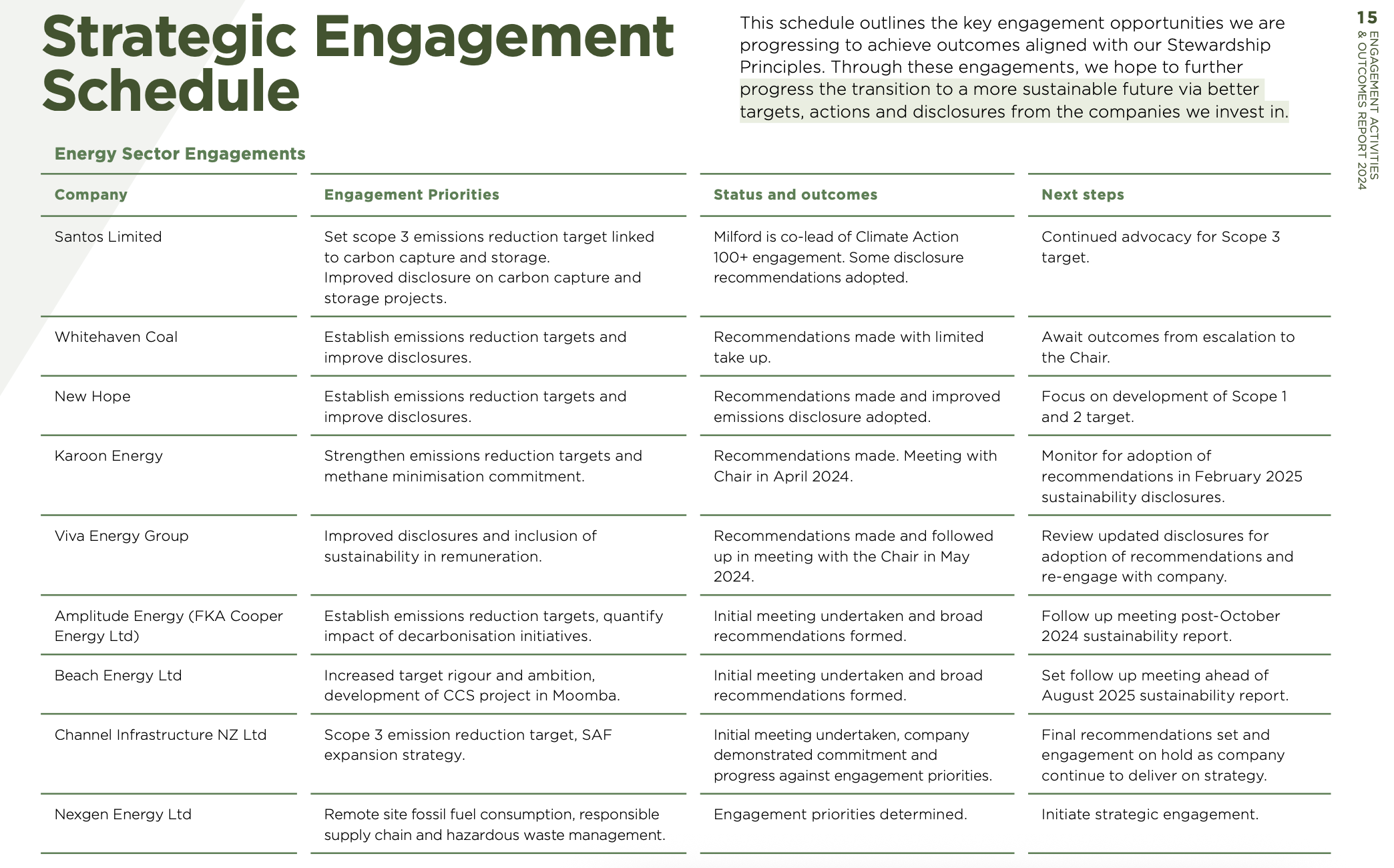 Below is an excerpt from Milford’s Engagement Activities & Outcomes Report 2024, summarising their strategic engagements. The full report is available here.